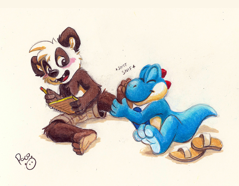 Yoshi sniffing panda paws